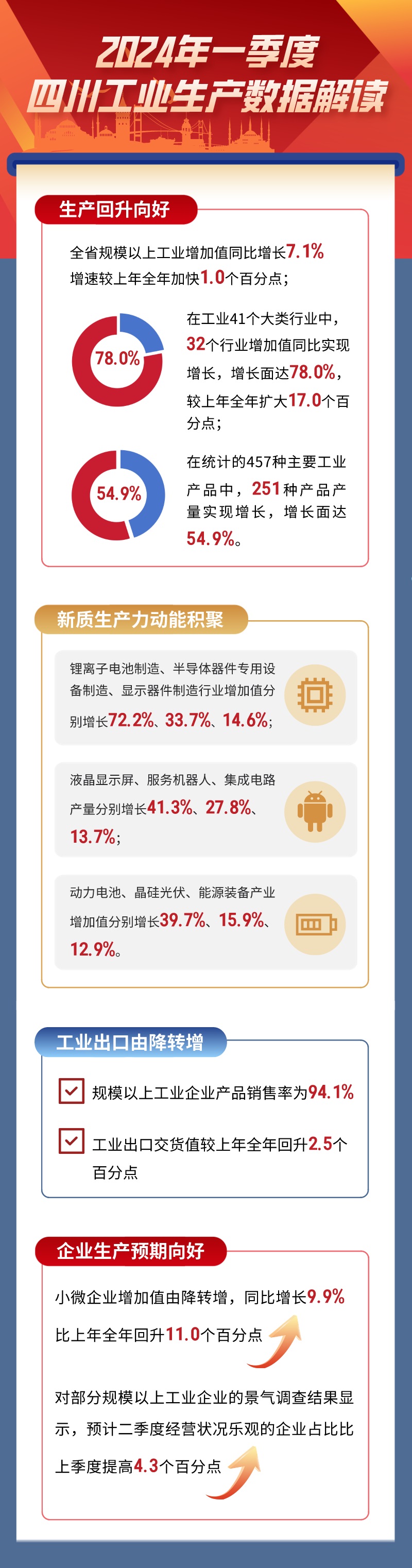 一季度,四川省工业生产稳步增长,多数行业和产品增速回升,新质生产力加快形成,小微企业持续恢复,工业经济实现良好开局。