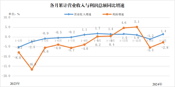 1-3月,规模以上工业企业每百元营业收入中的成本为82.1元,同比增加0.4元;每百元营业收入中的费用为8.2元,同比增加0.1元。
