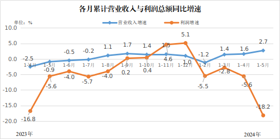 1-5月,全省规模以上工业企业实现营业收入19358.5亿元,同比增长2.7%;发生营业成本16170.4亿元,增长3.8%;营业收入利润率为7.0%,同比下降1.8个百分点。