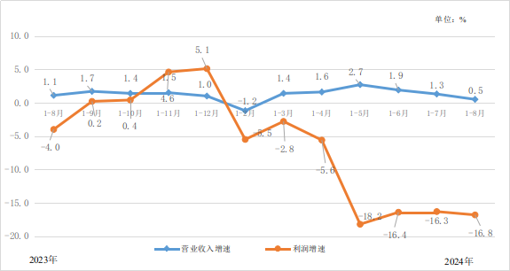 1-8月,规模以上工业企业每百元营业收入中的成本为83.5元,同比增加0.7元;每百元营业收入中的费用为8.2元,增加0.1元。