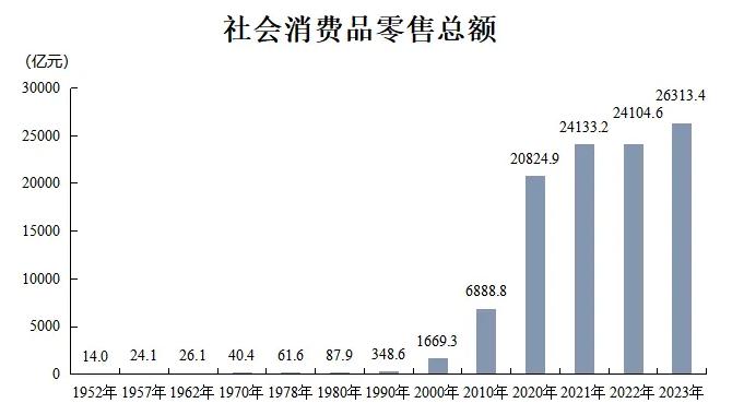随着市场经济持续快速增长,四川消费市场规模不断扩大。1952年四川社会消费品零售总额仅14亿元,1981年突破百亿元,1996年突破千亿元,2013年突破万亿元,2023年达到26313.4亿元,跃居全国第5位,是1952年的1879.5倍,年均增长11.2%、高于全国0.2个百分点。国际消费目的地加快建设,“蜀里安逸”消费品牌体系初步形成,成都成为全国首店经济第三城、夜间经济第一城。新模式新业态加快发展,2023年全省限额以上企业(单位)通过互联网实现的商品零售额达1796.9亿元,是2015年的5.4倍,年均增长23.5%,高于同期社会消费品零售总额年均增速15.1个百分点;占限额以上商品零售的比重达19.8%,比2015年提高14.6个百分点。