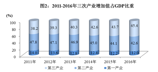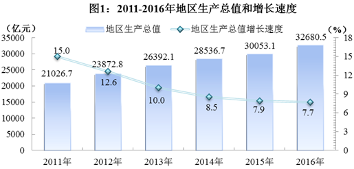 经国家统计局审定,全年实现地区生产总值(GDP)32680.5亿元,按可比价格计算,比上年增长7.7%。其中,第一产业增加值3924.1亿元,增长3.8%;第二产业增加值13924.7亿元,增长7.5%;第三产业增加值14831.7亿元,增长9.1%。三次产业对经济增长的贡献率分别为6.0%、42.5%和51.5%。人均地区生产总值39695元,增长7.0%。三次产业结构由上年的12.2:44.1:43.7调整为12.0:42.6:45.4。