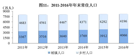 据2016年全国1%人口抽样调查资料测算,全年出生人口86.1万人,人口出生率10.48‰;死亡人口57.4万人,人口死亡率6.99‰;人口自然增长率3.49‰。年末常住人口8262万人,比上年末增加58万人,其中城镇人口4065.7万人,乡村人口4196.3万人。常住人口城镇化率49.21%,比上年末提高1.52个百分点。