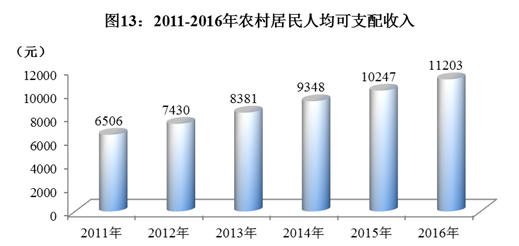 全年农村居民人均可支配收入11203元,比上年增加956元,比上年增长9.3%。其中,工资性收入3738元,增长7.9%;经营净收入4525元,增长7.8%;财产净收入269元,增长20.1%;转移净收入2672元,增长13.1%。农村居民人均生活消费支出10192元,增长10.2%。其中,居住消费支出增长14.5%,生活用品及服务消费支出增长5.0%,交通通信支出增长15.1%,医疗保健消费支出增长15.8%。农村居民恩格尔系数38.1%。