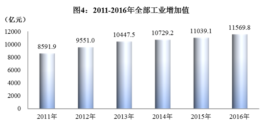 全年全部工业增加值11569.8亿元,比上年增长7.6%,对经济增长的贡献率为36.2%。年末规模以上工业企业13625户。全年规模以上工业增加值增长7.9%。