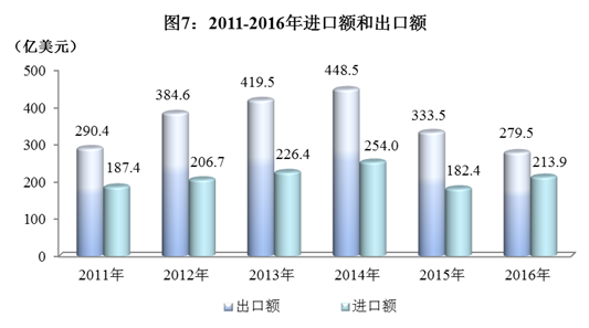 全年进出口总额493.3亿美元,比上年下降3.6%。其中,出口额279.5亿美元,下降15.6%;进口额213.9亿美元,增长18.2%。