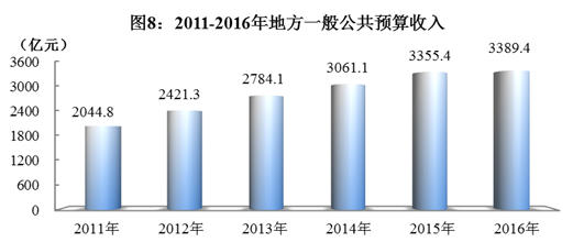 全年地方一般公共预算收入3389.4亿元,比上年增长8.3%,其中税收收入2329.2亿元,增长5.0%。一般公共预算支出8011.9亿元,增长9.8%。