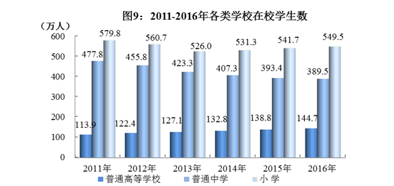 年末共有小学5981所,招生93.0万人,在校生549.5万人,小学学龄儿童入学率99.78%;初中3816所,招生84.6万人,在校生244.8万人;特殊教育125所,招生2525人,在校生1.3万人;普通高中739所,招生47.6万人,在校生144.7万人;中等职业教育526所,招生41.4万人,在校生101.9万人。职业技术培训机构4386个,职业技术培训注册学员250.8万人次。