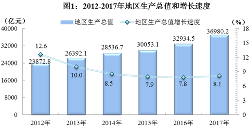 经国家统计局审定,全年实现地区生产总值(GDP)36980.2亿元,按可比价格计算,比上年增长8.1%。其中,第一产业增加值4282.8亿元,增长3.8%;第二产业增加值14294.0亿元,增长7.5%;第三产业增加值18403.4亿元,增长9.8%。三次产业对经济增长的贡献率分别为5.5%、40.8%和53.7%。人均地区生产总值44651元,增长7.5%。三次产业结构由上年的11.9:40.8:47.3调整为11.6:38.7:49.7。