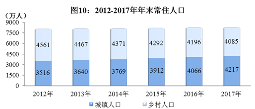 据2017年全国人口变动情况抽样调查资料测算,全年出生人口93万人,人口出生率11.26‰;死亡人口58万人,人口死亡率7.03‰;人口自然增长率4.23‰。年末常住人口8302万人,比上年末增加40万人,其中城镇人口4217万人,乡村人口4085万人。常住人口城镇化率50.79%,比上年末提高1.58个百分点。