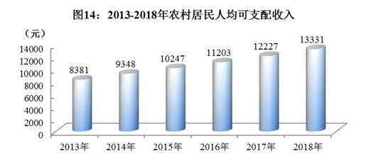 全年农村居民人均可支配收入13331元,比上年增加1104元,比上年增长9.0%。其中,工资性收入4311元,增长7.3%;经营净收入5117元,增长6.1%;财产净收入379元,增长17.7%;转移净收入3524元,增长14.9%。农村居民人均生活消费支出12723元,增长11.6%。其中,居住消费支出增长15.9%,生活用品及服务消费支出增长9.9%,交通通信支出增长14.5%,医疗保健消费支出增长29.3%。农村居民恩格尔系数35.2%。
