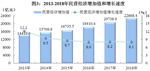 全年民营经济增加值22868.4亿元,比上年增长8.1%,占GDP的比重为56.2%,对GDP增长的贡献率为57.1%。其中,第一产业增加值1570.8亿元,增长2.0%;第二产业增加值10965.2亿元,增长6.1%;第三产业增加值10332.4亿元,增长12.8%。民营经济三次产业对民营经济增加值的贡献率分别为1.9%、42.1%、56.0%。民营经济三次产业结构由上年的7.8:52.8:39.4调整为6.9:47.9:45.2。