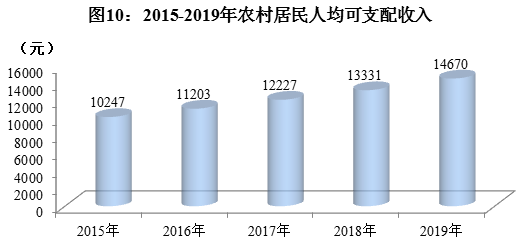 全年农村居民人均可支配收入14670元,比上年增加1339元,比上年增长10.0%。其中,工资性收入4662元,增长8.1%;经营净收入5641元,增长10.2%;财产净收入456元,增长20.3%;转移净收入3910元,增长11.0%。农村居民人均消费支出14056元,增长10.5%。其中,居住消费支出增长9.9%,生活用品及服务消费支出增长6.7%,交通通信支出增长14.5%,医疗保健消费支出增长14.6%。农村居民恩格尔系数34.7%。