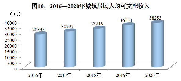 按常住地分,全年城镇居民人均可支配收入38253元,比上年增加2099元,比上年增长5.8%。其中,工资性收入21951元,增长7.2%;经营净收入4334元,下降1.3%;财产净收入3059元,增长5.8%;转移净收入8910元,增长6.2%。城镇居民人均消费支出25133元,下降0.9%。其中,居住支出增长4.4%,生活用品及服务支出增长4.9%,交通通信支出下降11.6%,医疗保健消费支出下降4.4%。城镇居民恩格尔系数34.8%
