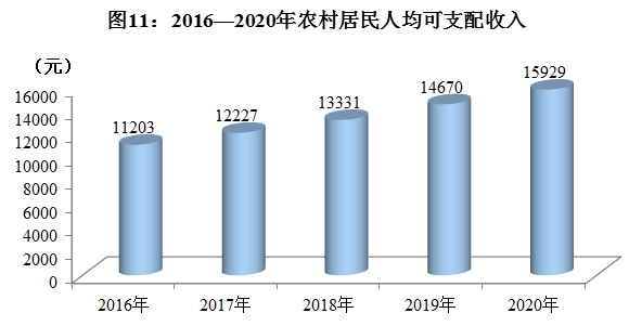 全年农村居民人均可支配收入15929元,比上年增加1259元,比上年增长8.6%。其中,工资性收入4978元,增长6.8%;经营净收入6152元,增长9.1%;财产净收入510元,增长11.8%;转移净收入4289元,增长9.7%。农村居民人均消费支出14953元,增长6.4%。其中,居住消费支出增长4.3%,生活用品及服务消费支出下降1.3%,交通通信支出增长7.0%,医疗保健消费支出增长1.8%。农村居民恩格尔系数36.6%