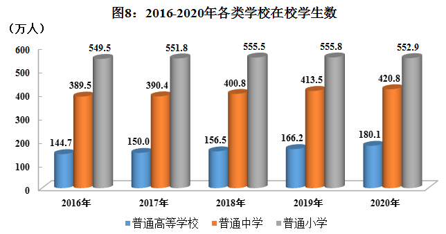年末共有普通小学5679所,招生88.1万人,在校生552.9万人。普通初中3677所,招生93.2万人,在校生279.8万人。普通高中792所,招生47.4万人,在校生140.9万人。特殊教育学校132所,招生0.3万人,在校生(含附设特教班)1.7万人。中等职业教育学校(含技工学校)493所,招生40.0万人,在校生94.7万人。职业技术培训机构4029个,职业技术培训注册学员165.3万人次。