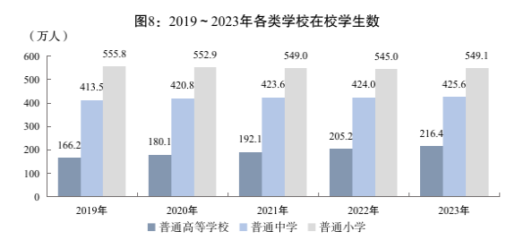 年末共有普通小学5119所,招生95.3万人,在校生549.1万人。普通初中3233所,招生91.2万人,在校生275.5万人。普通高中817所,招生51.1万人,在校生150.1万人。特殊教育学校138所,招生0.4万人,在校生(含附设特教班)2.0万人。中等职业教育学校(含技工学校)341所,招生30.0万人,在校生86.7万人。中等职业技术培训机构1890个,中等职业技术培训注册学员107.8万人次。