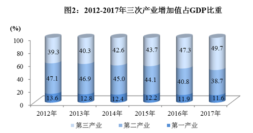 经国家统计局审定,全年实现地区生产总值(GDP36980.2亿元,按可比价格计算,比上年增长8.1%。其中,第一产业增加值4282.8亿元,增长3.8%;第二产业增加值14294.0亿元,增长7.5%;第三产业增加值18403.4亿元,增长9.8%。三次产业对经济增长的贡献率分别为5.5%40.8%53.7%。人均地区生产总值44651元,增长7.5%。三次产业结构由上年的11.940.847.3调整为11.638.749.7