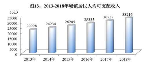 按常住地分,全年城镇居民人均可支配收入33216元,比上年增加2489元,比上年增长8.1%。其中,工资性收入18530元,增长7.1%;经营净收入3849元,增长7.3%;财产净收入2820元,增长7.4%;转移净收入8017元,增长11.1%。人均消费性支出23484元,增长6.8%。其中,居住支出增长14.4%,生活用品及服务支出增长11.3%,交通通信支出增长5.2%。城镇居民恩格尔系数31.8%。