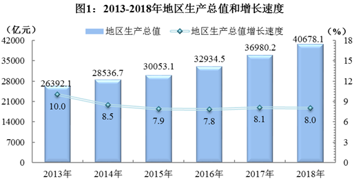 经国家统计局审定,全年实现地区生产总值(GDP)40678.1亿元,按可比价格计算,比上年增长8.0%。其中,第一产业增加值4426.7亿元,增长3.6%;第二产业增加值15322.7亿元,增长7.5%;第三产业增加值20928.7亿元,增长9.4%。三次产业对经济增长的贡献率分别为5.1%、41.4%和53.5%。人均地区生产总值48883元,增长7.4%。三次产业结构由上年的11.6:38.7:49.7调整为10.9:37.7:51.4。