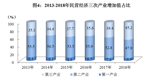 全年民营经济增加值22868.4亿元,比上年增长8.1%,占GDP的比重为56.2%,对GDP增长的贡献率为57.1%。其中,第一产业增加值1570.8亿元,增长2.0%;第二产业增加值10965.2亿元,增长6.1%;第三产业增加值10332.4亿元,增长12.8%。民营经济三次产业对民营经济增加值的贡献率分别为1.9%、42.1%、56.0%。民营经济三次产业结构由上年的7.8:52.8:39.4调整为6.9:47.9:45.2。