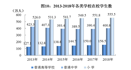 年末共有小学5730所,招生95.2万人,在校生555.5万人。初中3716所,招生92.4万人,在校生261.8万人。普通高中768所,招生46.2万人,在校生139.0万人。特殊教育学校128所,招生2649人,在校生(含附设特教班)1.5万人。中等职业教育学校(含技工学校)508所,招生37.6万人,在校生94.2万人。职业技术培训机构4147个,职业技术培训注册学员211.8万人次。