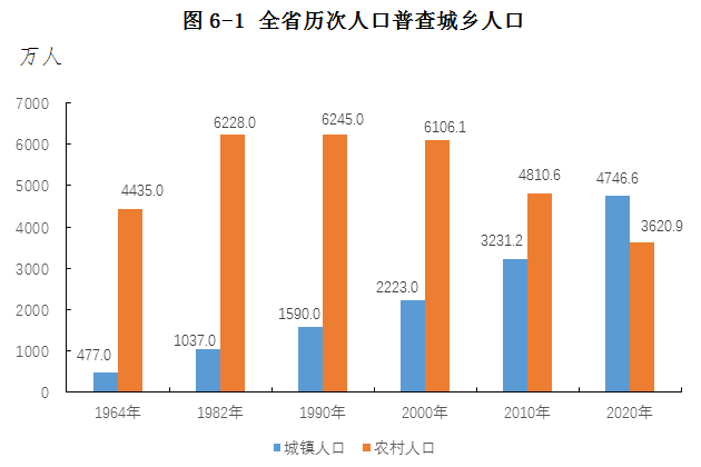 全省常住人口[3]中,居住在城镇的人口为47465912人,占56.73%;居住在乡村的人口为36208954人,占43.27%。与2010年第六次全国人口普查相比,城镇人口增加15153879人,乡村人口减少11897213人,城镇人口比重上升16.55个百分点。
